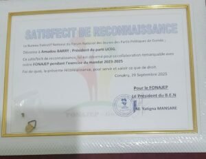 La session inaugurale a été marquée par un moment d’émotion et de reconnaissance. Le Forum des Jeunes des Partis Politiques de Guinée (FONAJEP), représenté par le Président de son nouveau bureau, Monsieur Lamine I Kamano, a décerné un satisfecit au Président de l’UCEG, Monsieur Amadou Barry. Cette distinction honorifique salue son dévouement, son courage et sa contribution au développement national.