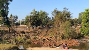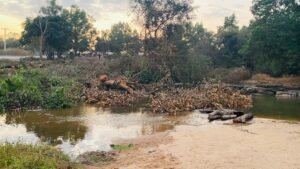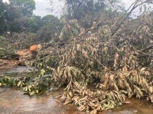 Sur le terrain, le constat est sans appel. Des arbres abattus lors des travaux jonchent le lit de la rivière, abandonnés sans aucune opération de dégagement. Les images prises sur place depuis plus de deux semaines témoignent d’une accumulation de troncs et de débris végétaux qui entravent l’écoulement naturel de l’eau. Aucune barrière de protection, aucun balisage environnemental, aucun dispositif de gestion des déchets de chantier n’a été déployé sur ce tronçon sensible.